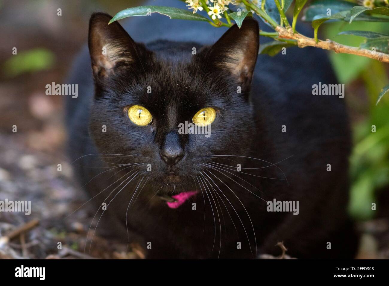 However, current medical investigations revealed that cranial issues may be connected to the gene. Black cat with yellow eyes sits on a tree in winter in the snow. The breed is instantly recognizable by her solid black coat and striking yellow eyes. The imperturbable face of a shiny black cat with yellow eyes. Black cat with yellow eyes lies on its side, legs outstretched on the laminate.